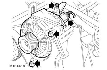 16. Remove lower bolt and upper nut and bolt securing alternator to front mounting plate.