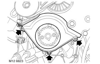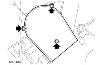 5. Remove 3 bolts securing camshaft timing belt LH rear cover and remove cover.