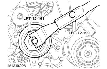 25. Remove tools LRT-12-161 and LRT-12-199 from crankshaft pulley, remove crankshaft pulley.