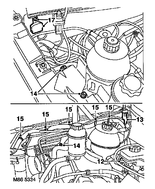 14. Remove bolt and 2 nuts securing PAS and coolant reservoir support bracket and position aside.