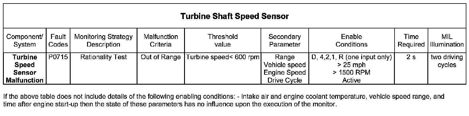 If the vehicle speed exceeds 25 mph and the engine speed is above 1500 RPM while the turbine revolution is less than 600 RPM, after a period of 2 seconds a Turbine Failure is detected.