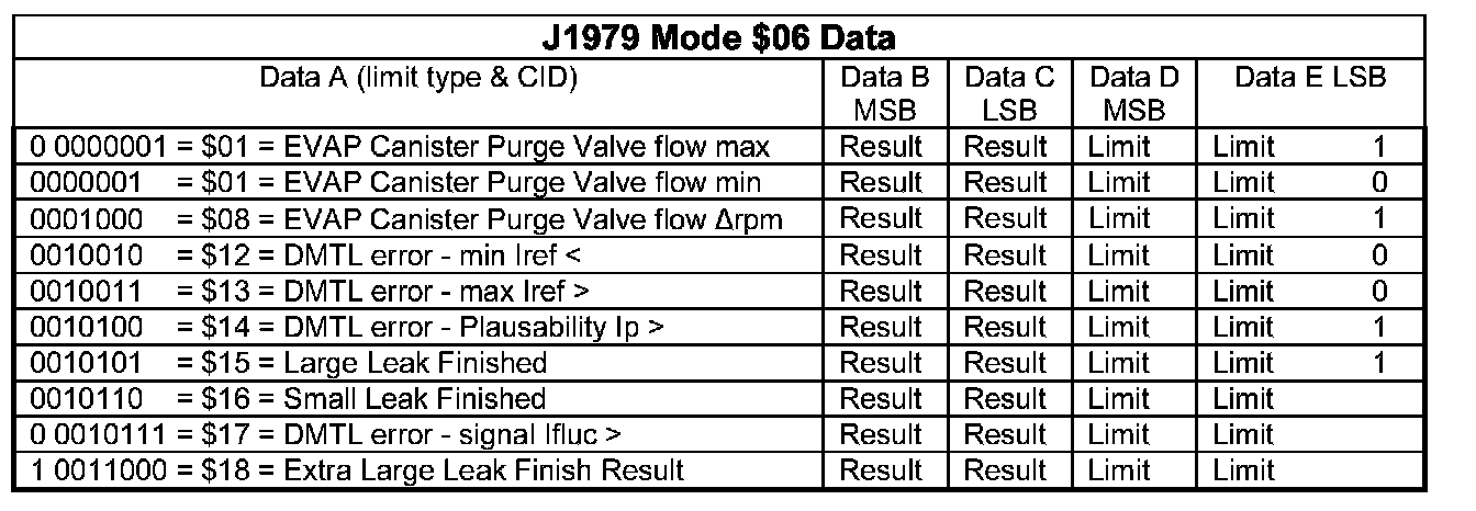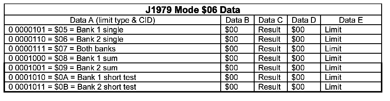 Mode $06 enables access to the most current diagnostic results and thresholds of non-continuous diagnostic routines. A Component Identifier (CID) identifies each individual parameter.