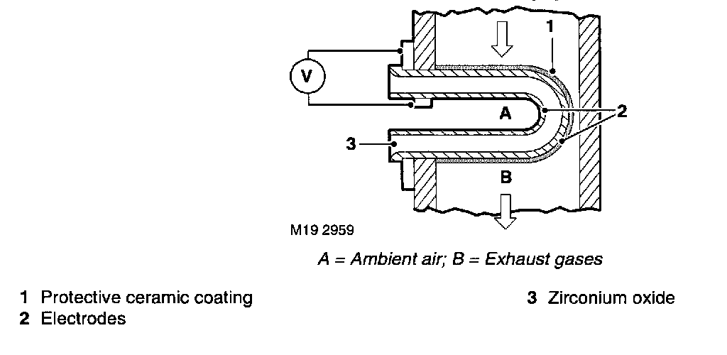 Each HO2S consists of a sensing element with a protective ceramic coating on the outer surface. The outer surface of the sensing element is exposed to the exhaust gas, and the inner surface is exposed to ambient air. The difference in the oxygen content of the two gases produces an electrical potential difference across the sensing element. With a rich mixture, the low oxygen content in the exhaust gas results in a higher sensor voltage. With a lean mixture, the high oxygen content in the exhaust gas results in a lower sensor voltage.