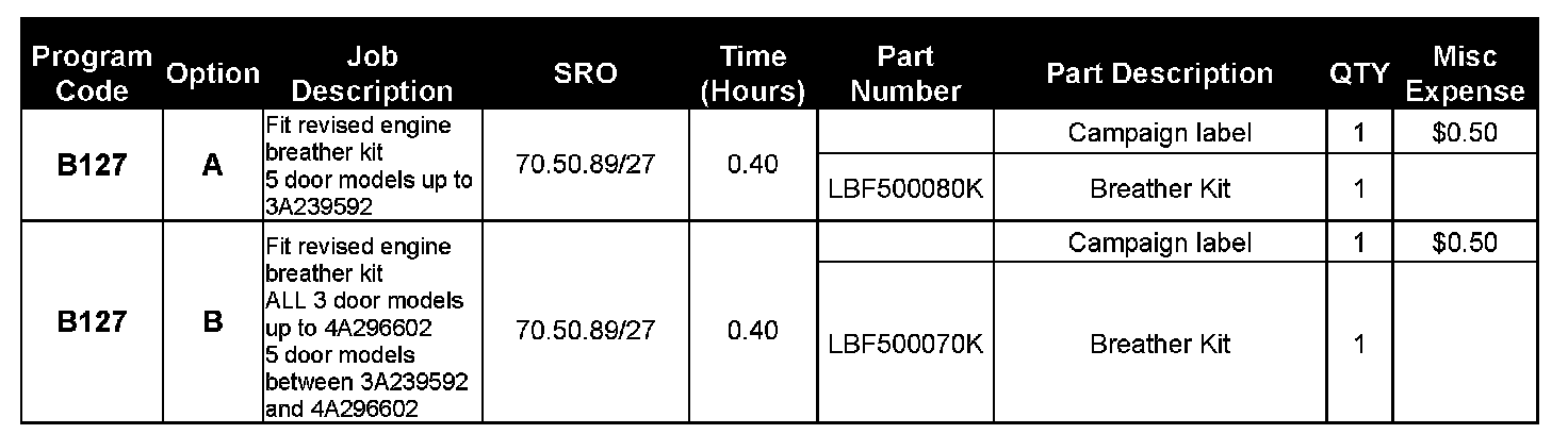 Install revised engine breather kit ALL 3-door models up to 4A296602 5 door models between 3A239592 and 4A296602