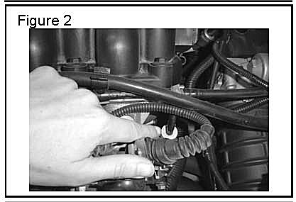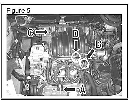 15. Connect the new breather hose to the inlet manifold plenum connector. (C in Figure 5)
