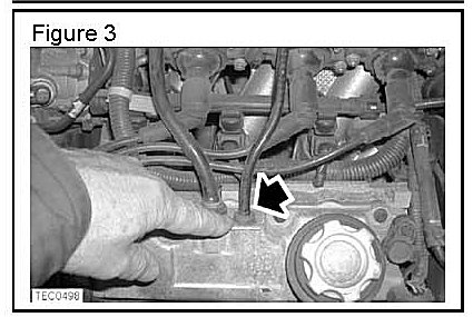 6. Depress the locking collar and release the breather hose from the front camshaft cover. (Arrowed in Figure 3)