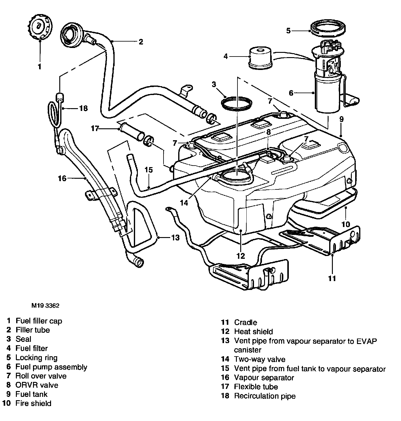 The fuel tank is located on the underside of the vehicle, forward of the rear suspension subframe. The tank is constructed from moulded plastic and is retained by a tubular cradle which is secured to the vehicle floorpan with four bolts. A heat shield is installed on the LH side of the support cradle to protect the tank from heat radiated by the exhaust system. A fire shield is installed on the RH side of the support cradle.