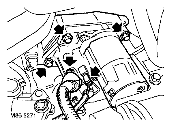 4. Remove 3 bolts securing starter motor to gearbox noting that the LH bolt also secures the mounting bracket for the CKP sensor multiplug.