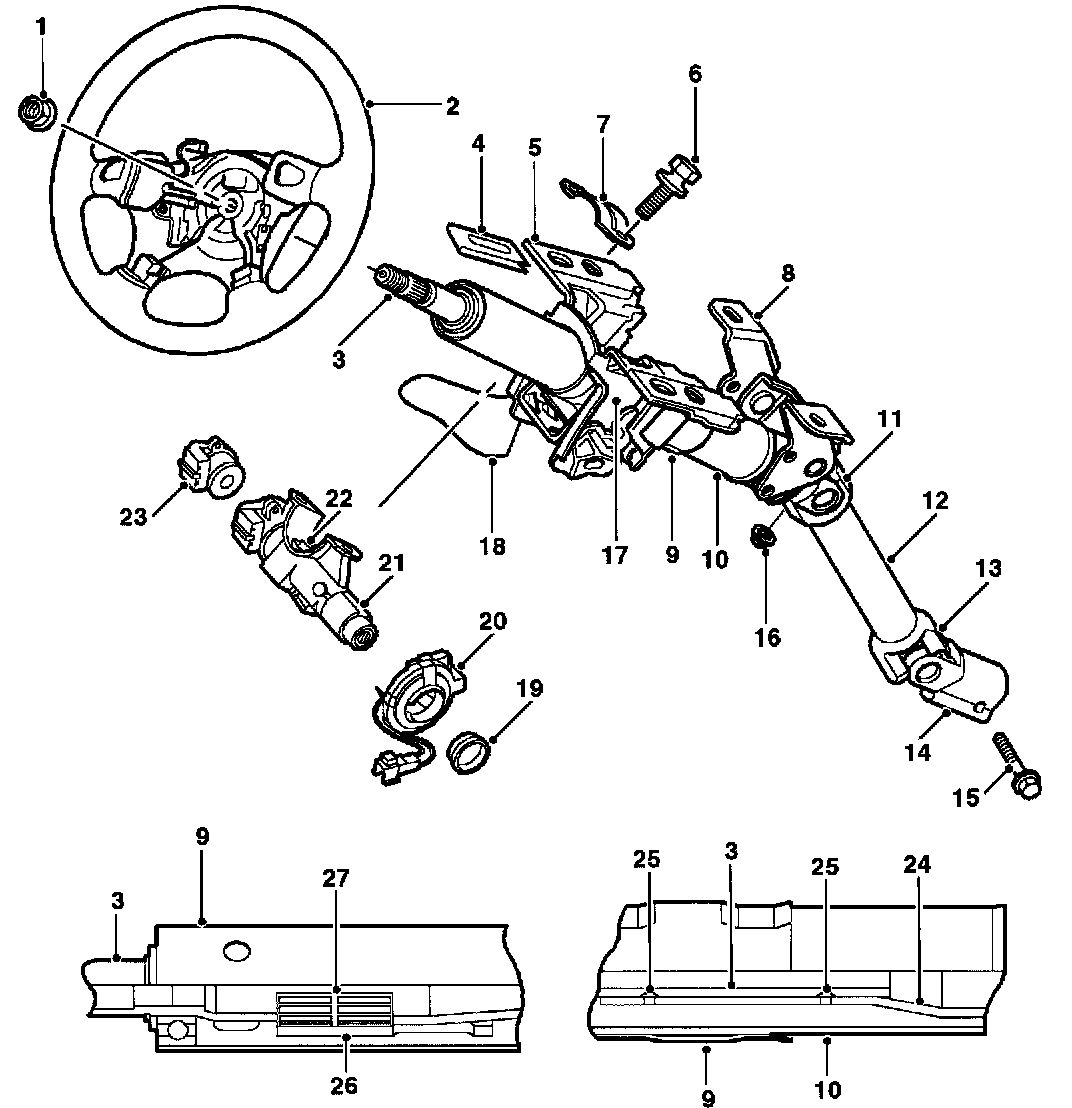 The central shaft comprises of two parts and is located in bearings in the upper and lower column tubes. The upper shaft is located inside the lower shaft. Mating cross holes in each shaft are connected by nylon injection molded shear pins.