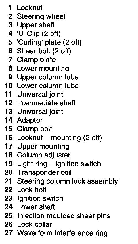 The steering lock operates by a bolt, which emerges when the ignition key is turned to position 0 and the ignition key removed. The bolt engages in a lock collar located on the upper shaft in the upper column tube. The lock collar is attached to the upper shaft by a "wave form" interference ring, which allows the lock collar to slip on the upper shaft if a torque of 200 Nm (147.5 ft. lbs.) or higher is applied. This prevents the bolt being sheared, by someone forcibly turning the steering wheel while the steering lock is engaged, yet still effectively locks the steering. The steering lock is also designed to be resistant to slide hammer and shock retraction.