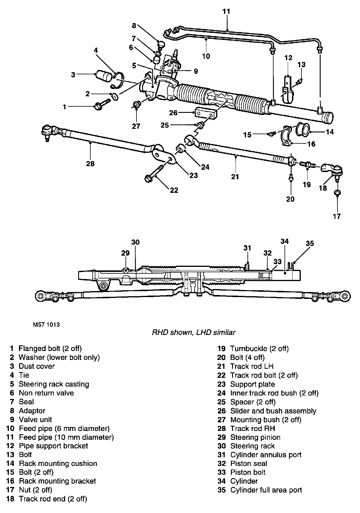 The steering rack is mounted in the engine compartment on the lower part of the bulkhead. The rack is retained with two bolts through cast lugs near the valve unit and two bolts which secure a clamp over the opposite end of the rack. The lower bolt through the cast lug is fitted with a large washer. The steering rack is handed for left and right hand drive vehicles.