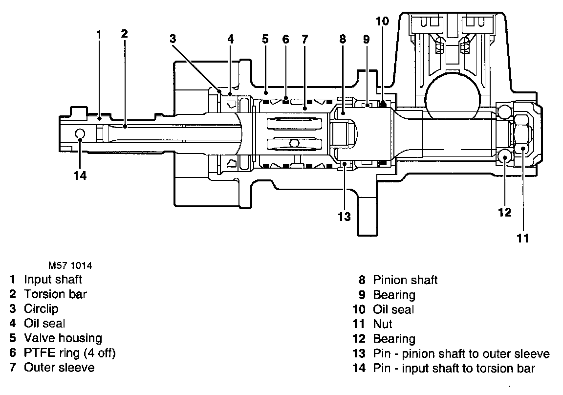 The pinion shaft has machined teeth on its central diameter that mate with the teeth on the steering rack. A slot machined in the upper end of the pinion shaft mates with the dog-tooth on the input shaft. The pinion shaft locates in a cast housing that is part of the steering rack and rotates on ball and roller bearings.