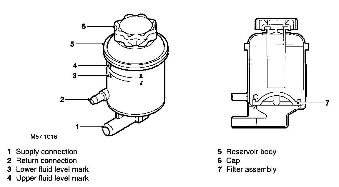 A filter assembly is fitted into the bottom of the reservoir. The filter is made from fine nylon mesh that is molded into the frame of the filter. The filter removes particulate matter from the fluid before it is drawn into the supply connection and is non-serviceable.
