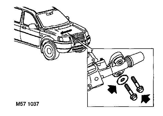 8. Fit washers and new bolts securing steering rack mounting to bulkhead, but do not tighten at this stage. Ensure large washer is fitted to lower bolt.