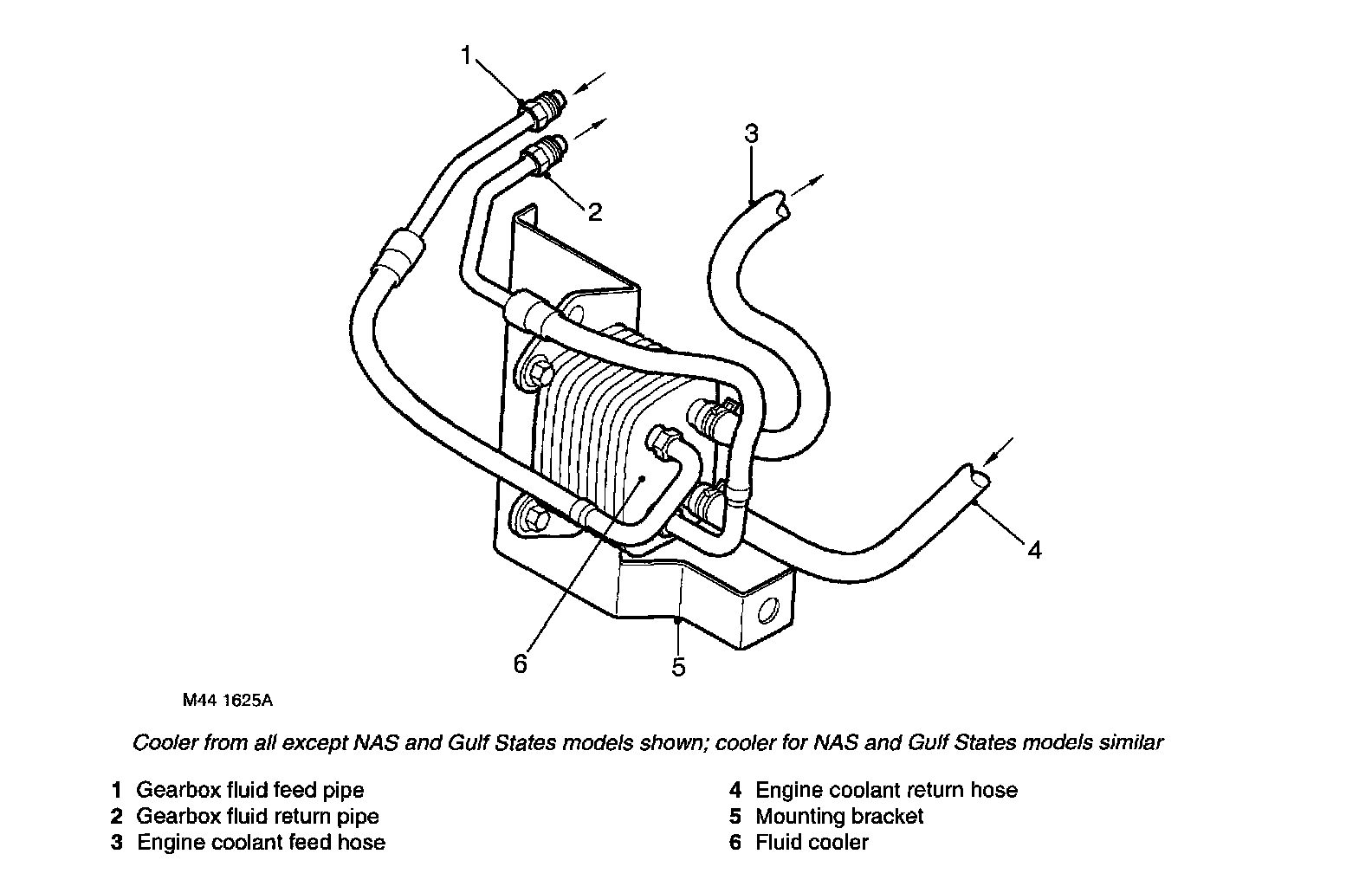 The engine coolant flows from the engine oil cooler (on all except NAS and Gulf States models), or the cylinder block (on NAS and Gulf States models), to the lower coolant connection on the fluid cooler. The coolant exits the cooler via the upper connection and flows to the thermostat housing.