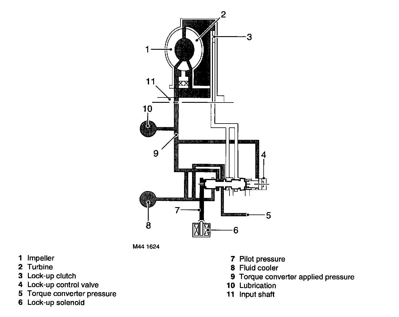 The torque converter consists of an impeller, stator and turbine. The engine drives the impeller, while the turbine drives the gearbox. The stator is situated between the impeller and turbine on a one-way clutch. The impeller picks up fluid and throws it out into the turbine, thereby causing it also to rotate and transmit power.
