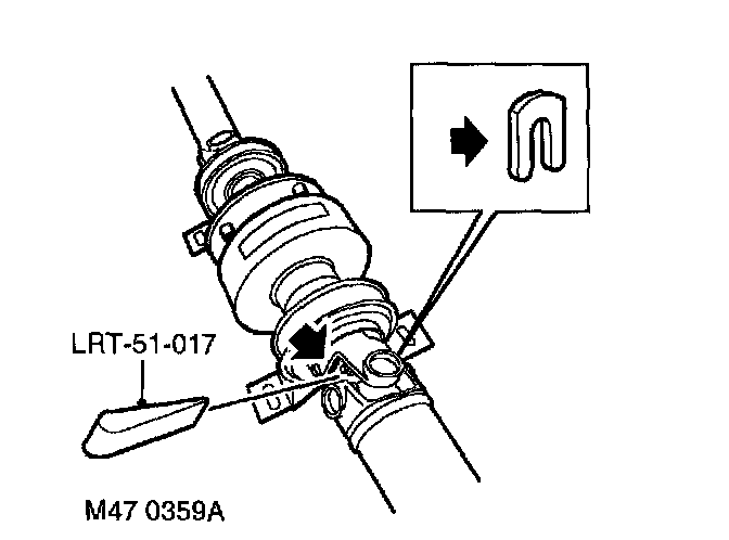 4. To disengage the splines, insert wedge LRT51-017 between the bolt head and the universal joint yoke. Screw the bolt in or out to correctly position the wedge between the yoke and the bolt head. Drive the wedge in squarely to separate the components.