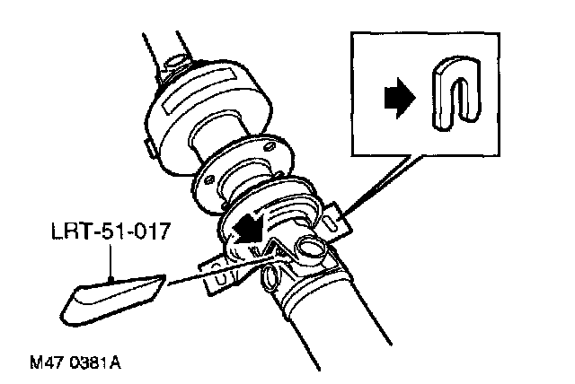 4. To disengage the splines, insert wedge LRT51-017 between the bolt head and the universal joint yoke. Screw the bolt in or out to correctly position the wedge between the yoke and the bolt head. Drive the wedge in squarely to separate the components.
