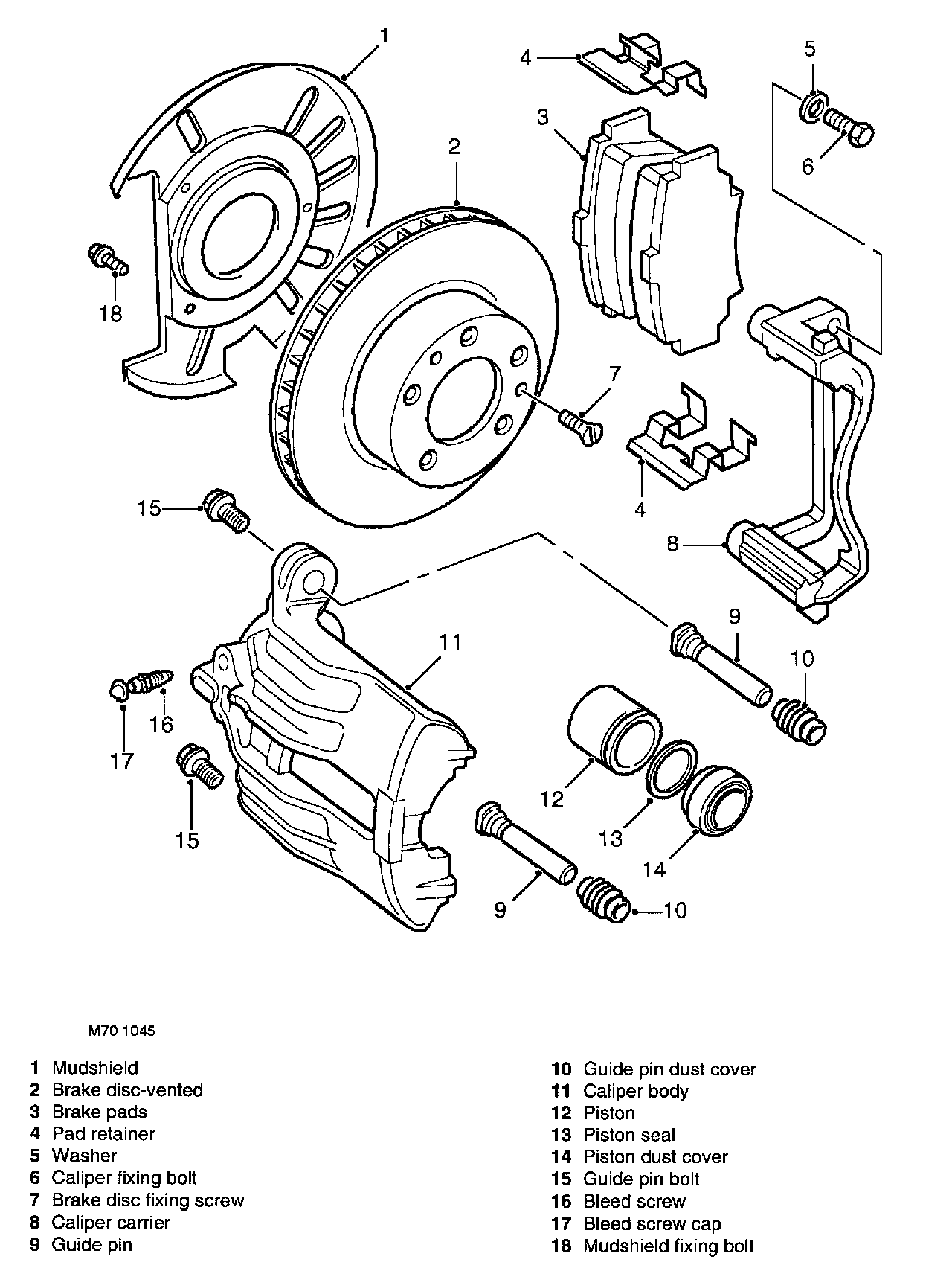 The front brakes each comprise a hub mounted, single piston caliper assembly and a vented disc. The inboard side of the disc is protected by a mudshield.