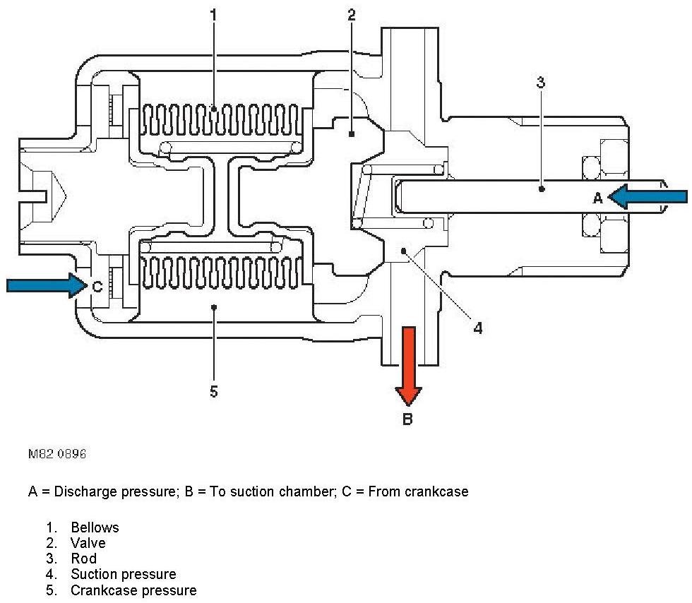 The control valve regulates the crankcase pressure as a function of outlet pressure, so that the flow rate of the compressor matches the thermal load.