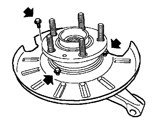 15. Remove 3 bolts securing brake disc shield.