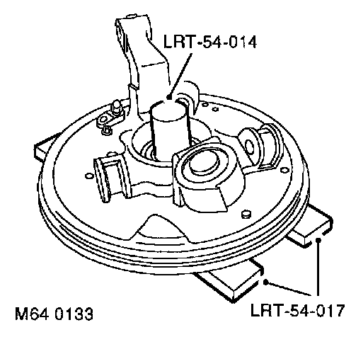 14. Position hub assembly to press, support on tools LRT-54-017 and press out drive flange using tool LRT-54-014.