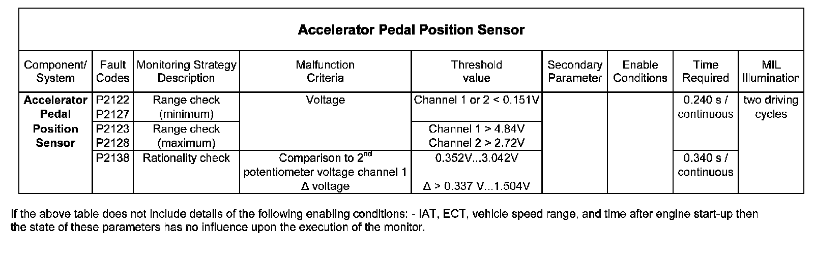The APP sensor is used to determine the engine torque demand requested by the driver. The sensor consists of 2 independent potentiometers that produce an output voltage proportional to the angular position of the throttle pedal. Each potentiometer has a separate 5 V supply and ground direct from the ECM.