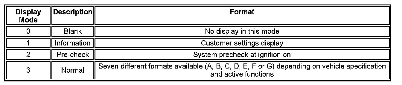 The message center has four different display modes. Each mode is displayed depending on vehicle operating conditions and driver requests. The display modes are detailed in the following table: