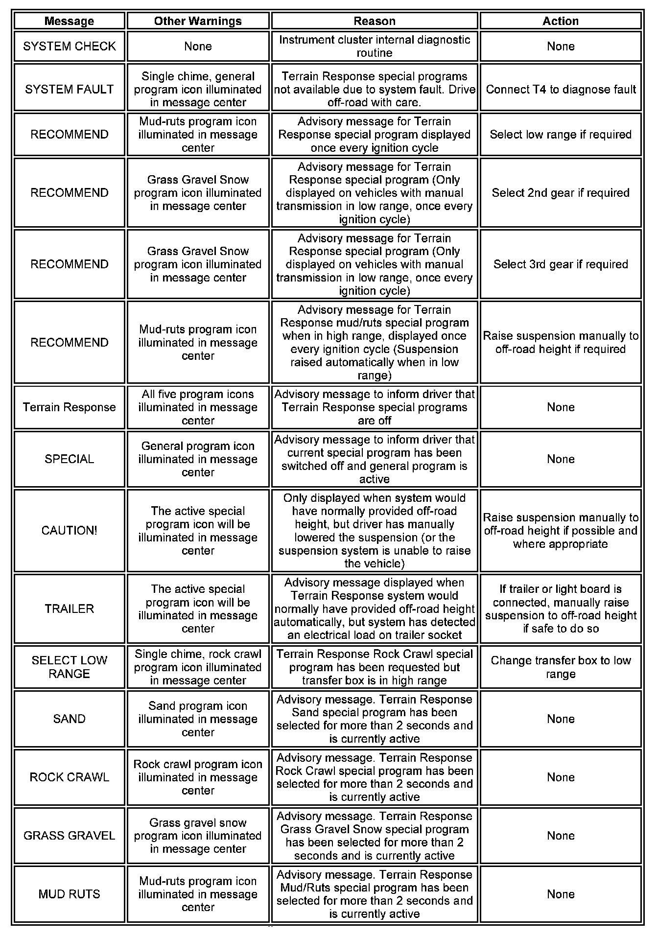 If a Terrain Response(TM) message is received, the display will change to a mode 3 display, appropriate for the additional information to be displayed. The instrument cluster reviews the information required to be displayed and shows the appropriate format.