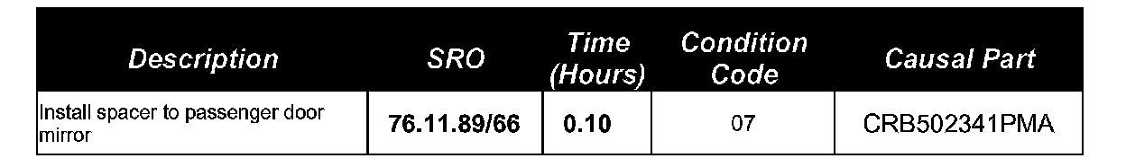 A customer may report a concern of an inability to adjust the passenger door mirror to the desired inboard view along the passenger side of the vehicle when the driver seat is in the fully forward position, even when the door mirror is adjusted fully inboard. Insufficient inboard travel of the passenger side door mirror when the driver's seat is fully forward is the cause.