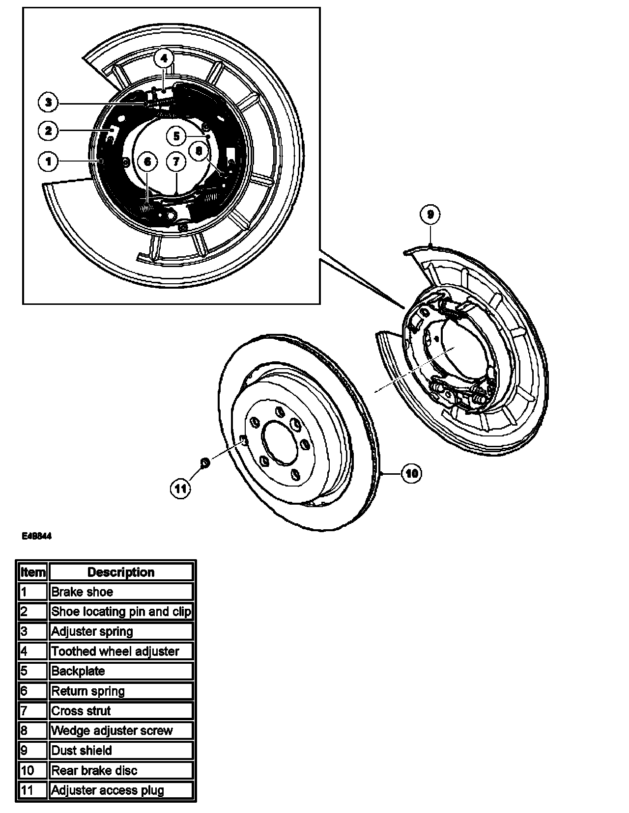 Each drum brake consists of a pair of brake shoes installed on a backplate attached to the rear hub carrier. The brake shoes operate on the drum integrated into the rear brake disc. The orientation of the brake shoes differ by 180' between the LH and RH brakes.