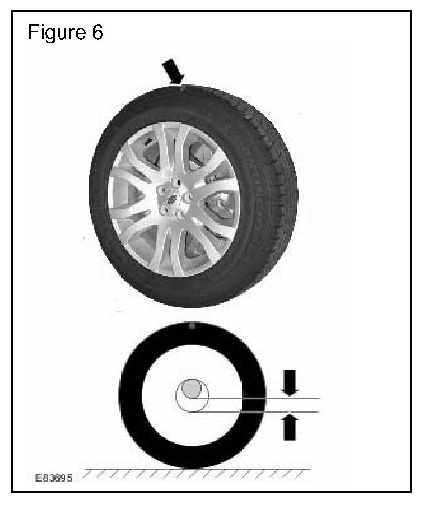 7. The high-point of RFV should be marked, and the road wheel and tire assembly installed to the vehicle with the RFV high point at the top, prior to the wheels being tightened. (Figure 6)