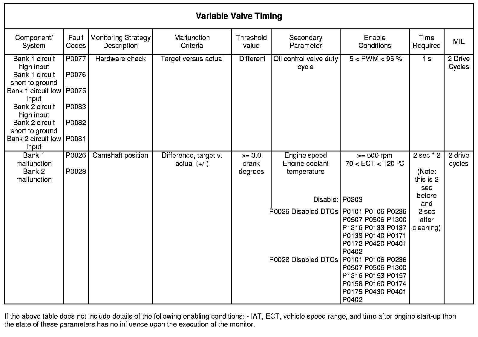 This monitor checks the oil control valve on both banks 1 and 2. The commanded and actual state of the oil control valve are continually checked as long as the PWM drive signal remains within limits. If the commanded and actual state of the oil control valve differ for longer than a predefined time period then a failure is registered. The ECM determines the type of failure by examining which state the valve was unable to attain and the output signal to the valve. If a failure is registered on 2 drive cycles, the MIL will illuminate.