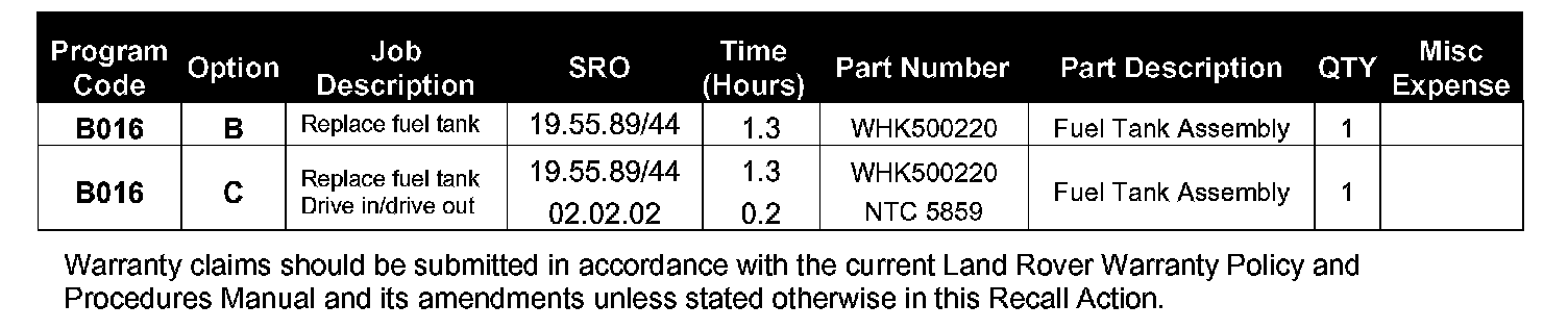Warranty claims should be submitted quoting program code B016 together with the appropriate option code. As option codes are used, there is no requirement to enter parts or labor. They are provided for information only.