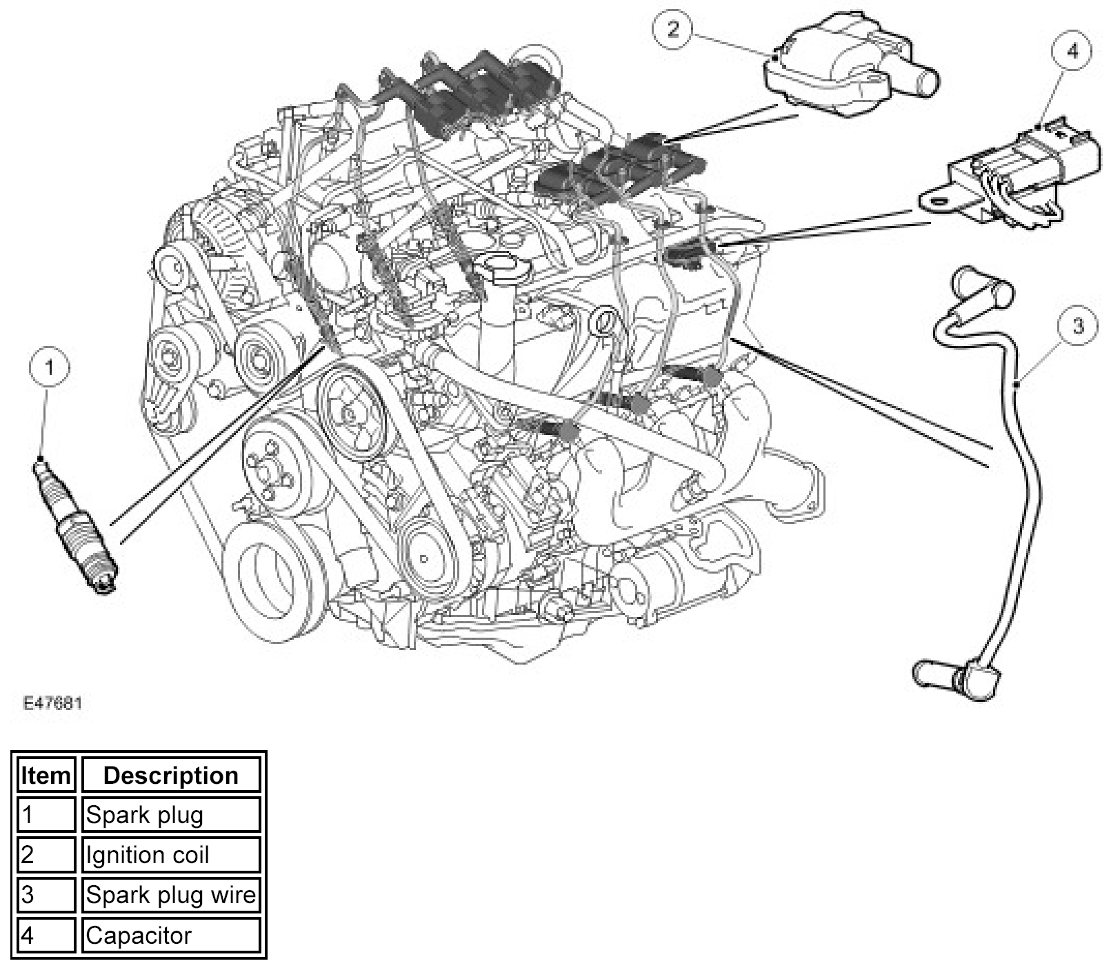 The 4.0L engine ignition system has a single platinum tipped spark plug per cylinder, with each spark plug powered by a separate remote ignition coil. The three ignition coils for each cylinder bank are grouped together on the related side of the air inlet manifold. The ignition coils are directly driven by the Engine Control Module (ECM).