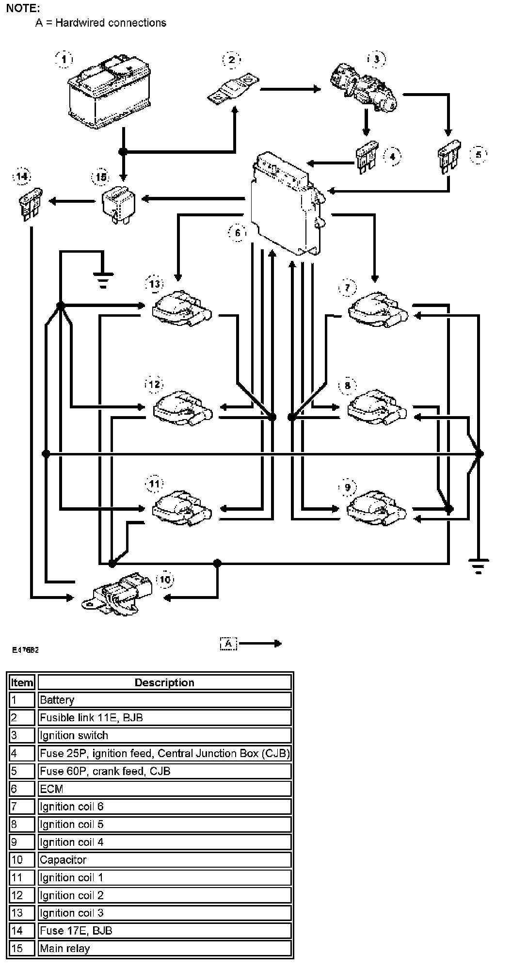 Power for the ignition coils is supplied from the main relay and a fuse in the Battery Junction Box (BJB).