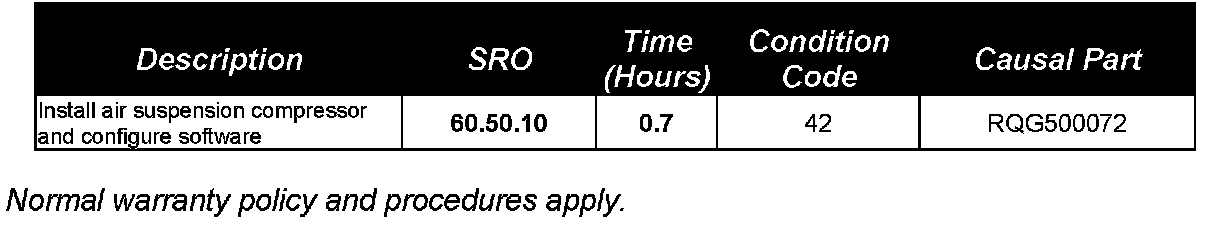 Part RQG500090 is the latest specification air compressor with a stronger exhaust valve return spring. When the new air compressor is installed the air suspension control module software must be updated to the latest specification, using WDS disc 13 or later.