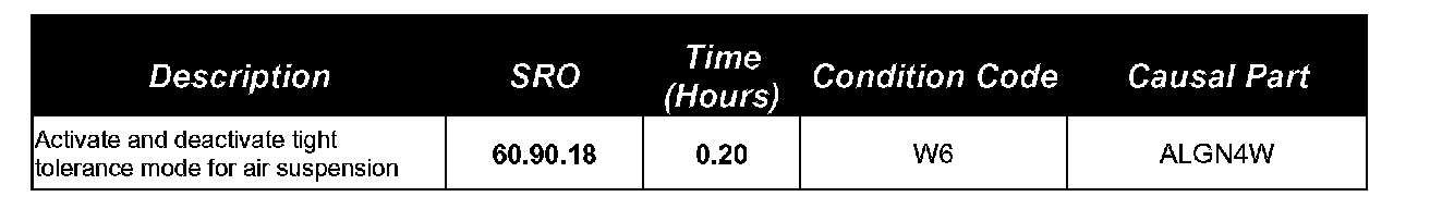 Labor operation 60.90.18 and associated time of 0.2 hours to activate and deactivate Tight Tolerance mode replaces the need to check or re-calibrate the air suspension system. The labor time of 1.1 hours to calibrate the air suspension system has been removed and the labor time of 0.2 hours to activate/deactivate Tight Tolerance mode has been included in the revised labor times listed in Table 1.