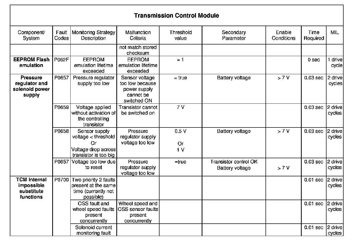 12. Two or more faults exist on related speed sensor inputs to the TCM. In this instance, the TCM is unable to generate a substitute values for either of the signals and so can no longer adequately control the transmission system.
