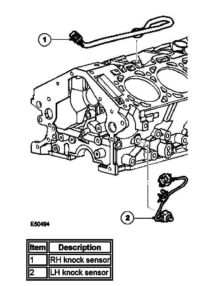 The knock sensors are installed in the cylinder block in two different locations. One is located on the inboard of the RH cylinder bank and one is located at the front of the LH side of the cylinder block, next to the oil pressure switch. They are piezo-electric sensors that provide inputs to detect and locate detonation during combustion.