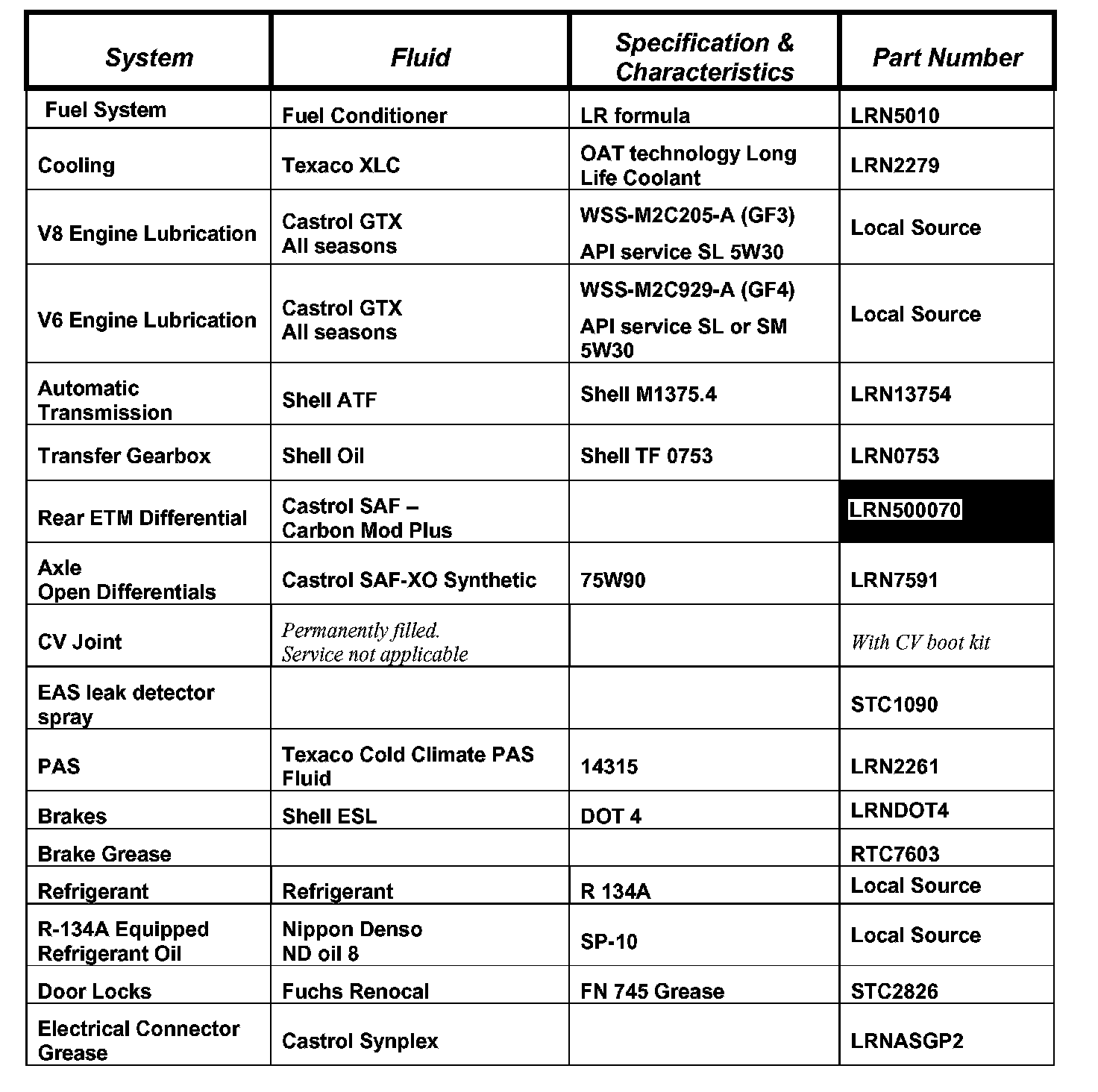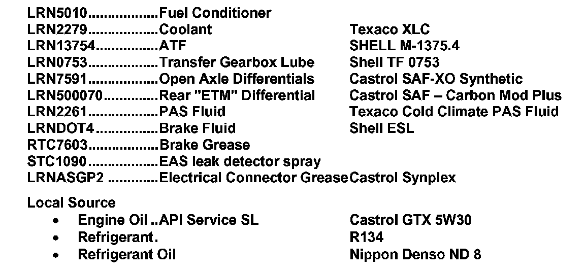 A number of Systems in the LR3 use new or in some cases unique fluids and lubricants. The appended parts listing and use table will assist retailers to maintain supply of these lubricants and will provide a quick reference to the proper specifications for each application.