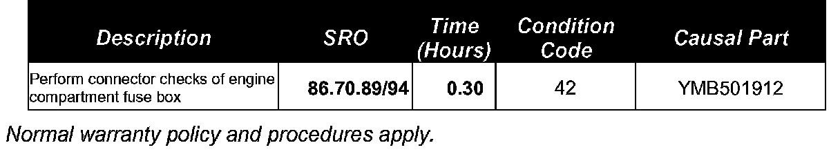 Diagnosis may indicate power supply problems. The complaints may be as a result of a poor connection or damaged/dislodged terminals in the battery junction box (BJB).