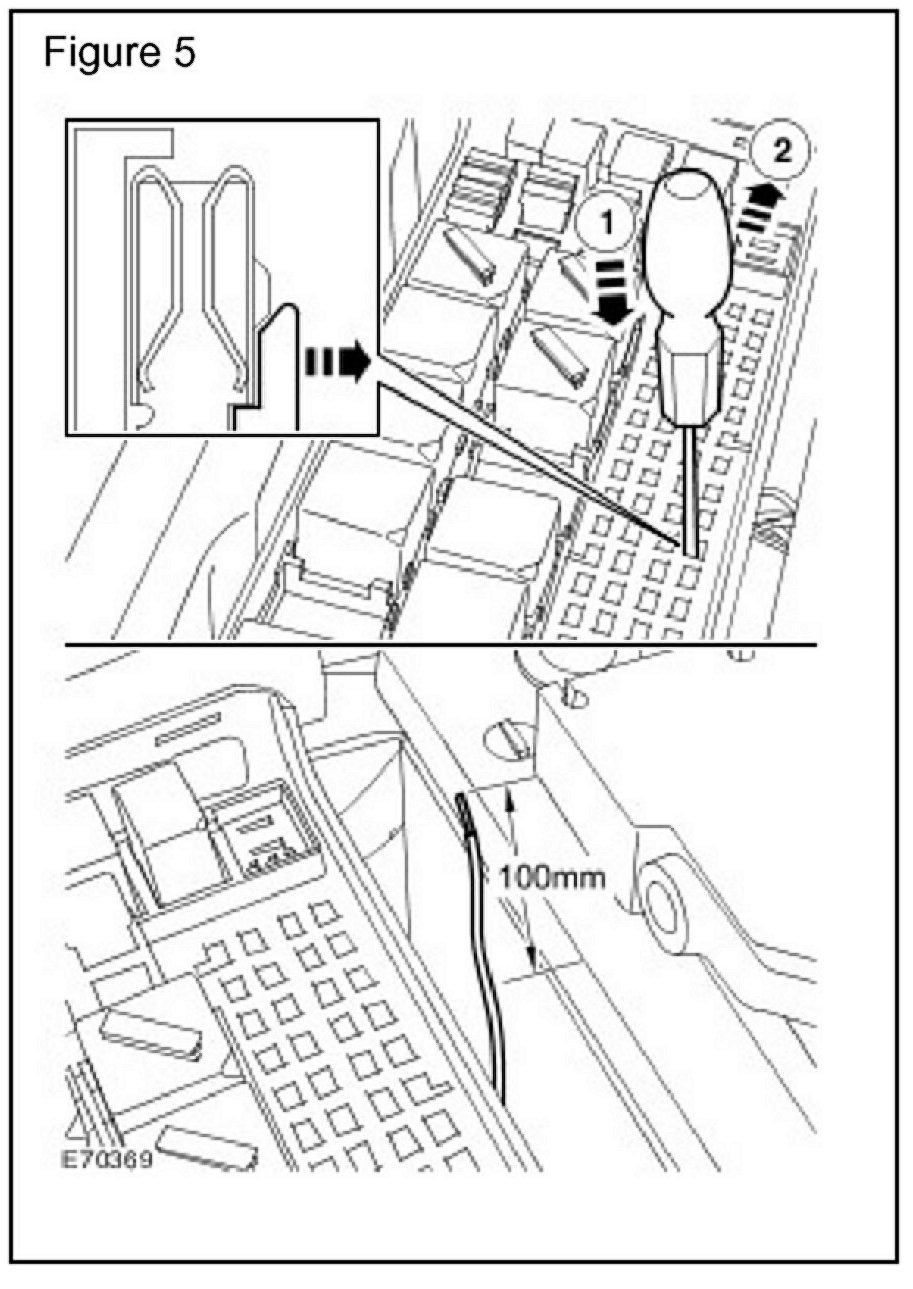 ^ Using special tool YRW500030 from the harness repair kit, release the damaged terminal from the aperture by disengaging the terminal securing tang and pulling the wire/terminal from the underside of the fuse box.