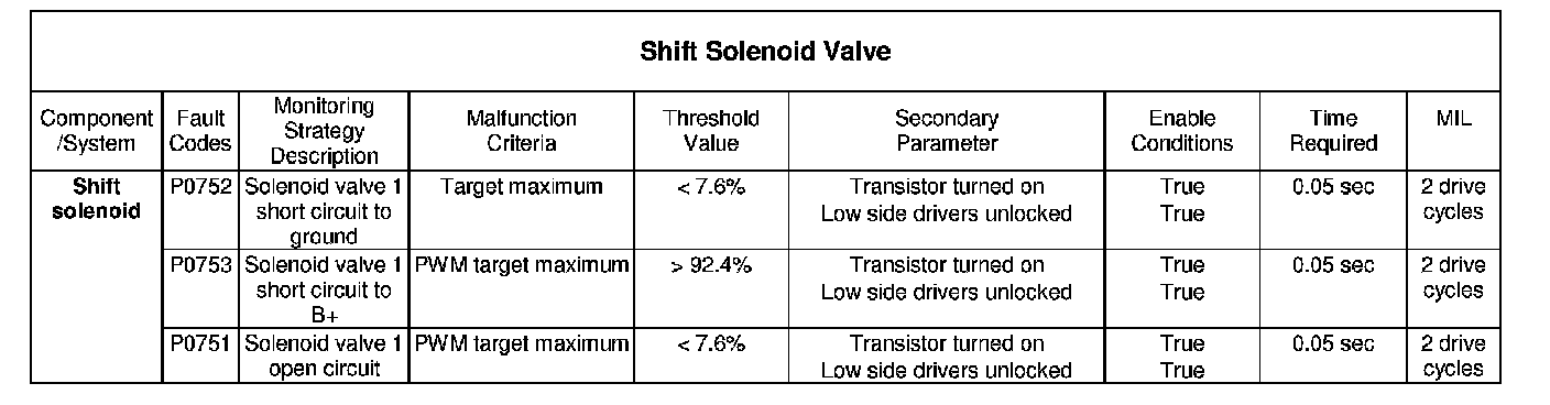 The diagnostic monitors the feed back voltage from the solenoid, the methods of fault detection dependent on the PWM duty cycle. Short circuits to Battery positive or ground, or open circuit can be detected.