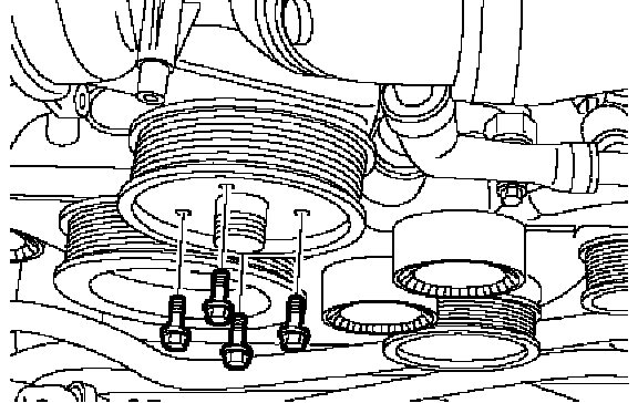 5. Ensure mating faces of coolant pump pulley and flange are clean. Fit pulley and finger tighten securing bolts.