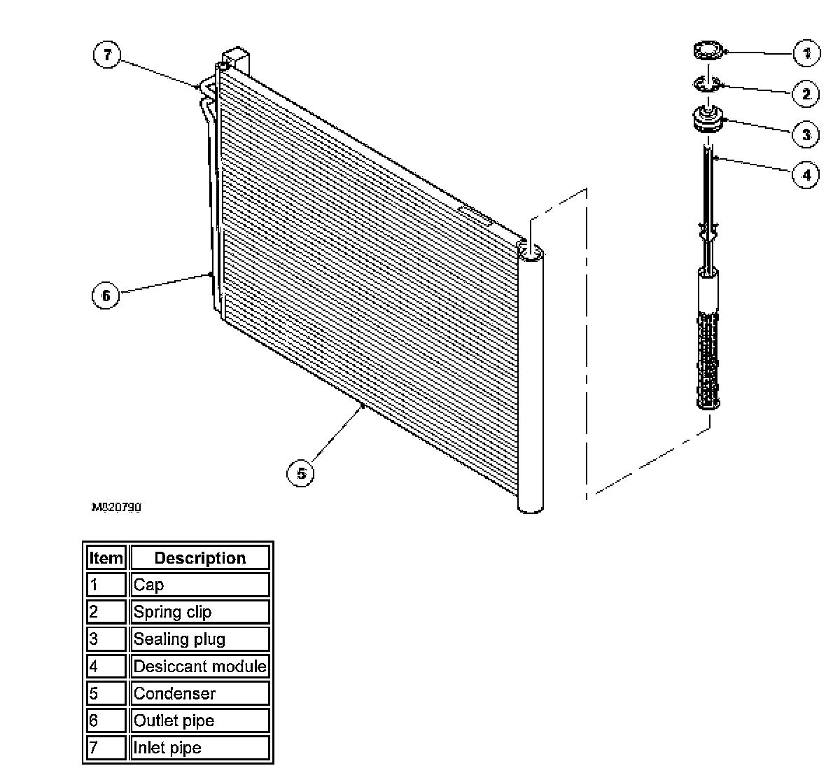 The condenser transfers heat from the refrigerant to the surrounding air to convert the vapor from the A/C (air conditioning) compressor into a liquid. A receiver drier module, integrated onto the LH (left-hand) side of the condenser, incorporates a filter and a desiccant to remove solid impurities and moisture from the refrigerant. The receiver drier module also functions as a reservoir for liquid refrigerant, to accommodate changes of heat load at the evaporator.