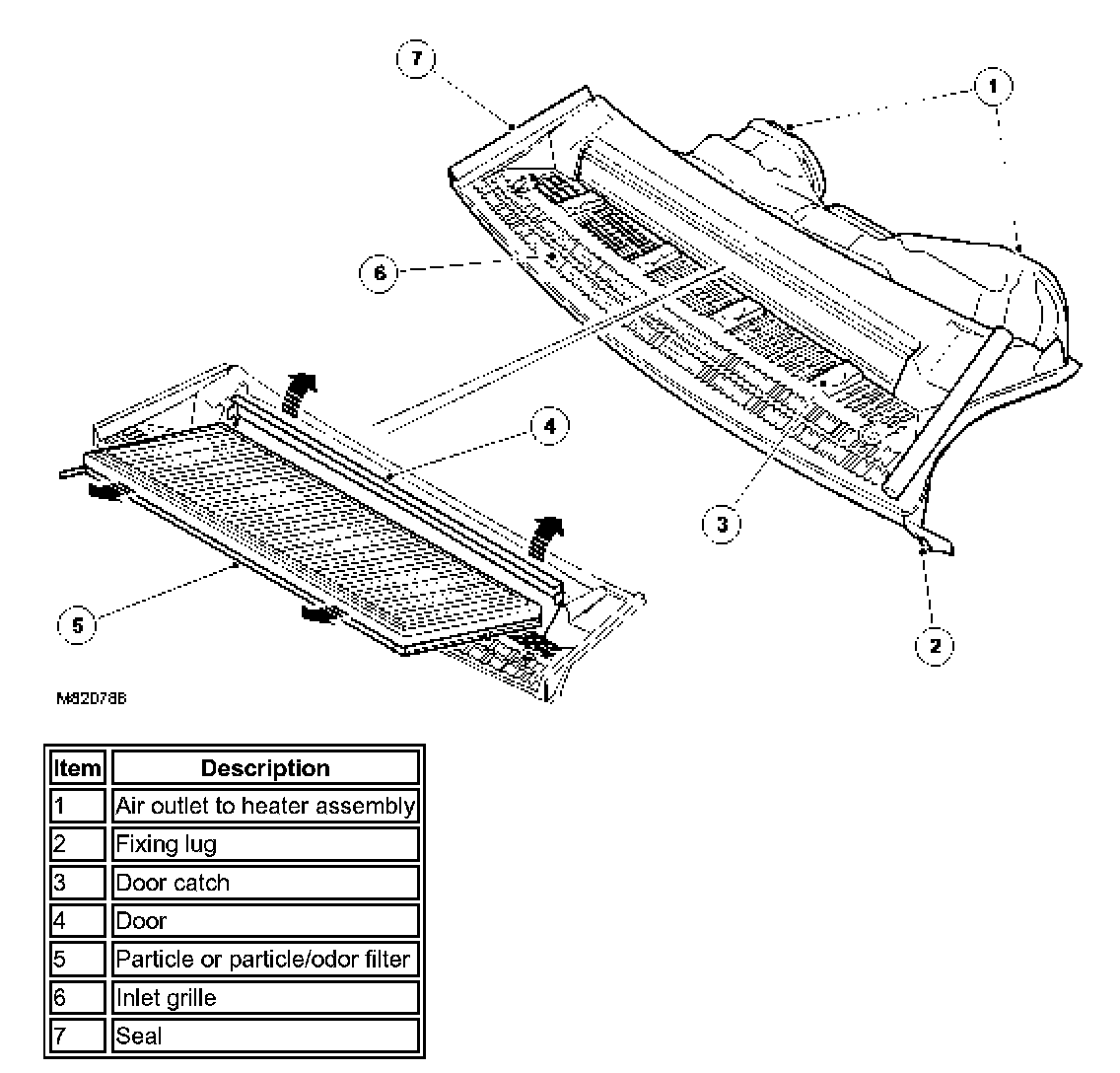 The air inlet duct directs fresh air from above the hood into the heater. The air inlet duct is centrally mounted on the engine bulkhead, below a ventilation grill in the hood, and secured to the bulkhead closing panels.