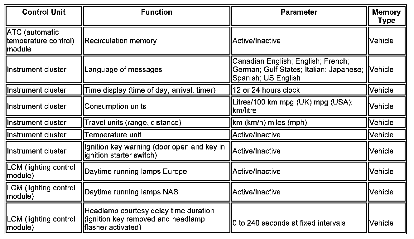 The car memory contains vehicle function settings that can be changed to suit market and customer preferences. In some markets, some of the functions in the vehicle memory are blanked out due to marketing and statutory requirements. Where available, the settings can be changed using T4.