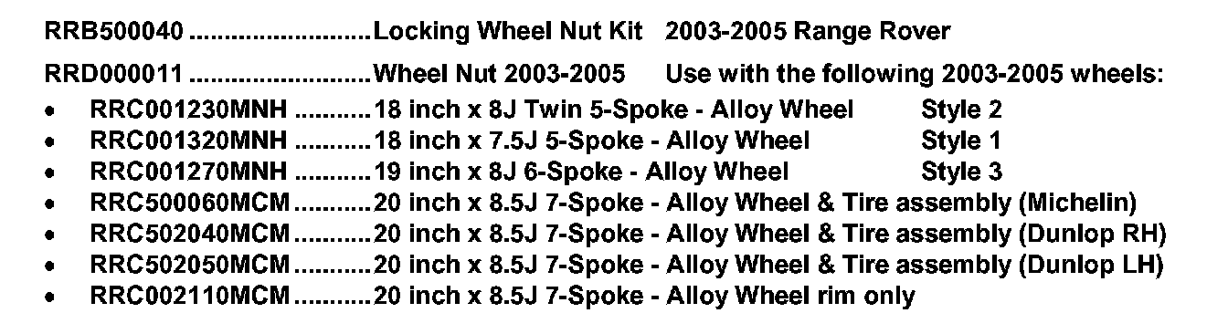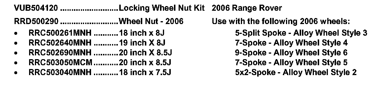 Action: Wheels and wheel nuts (KIT or standard equipment) used on 2003 2005 MY Range Rovers must not be used on 2006 MY vehicles. Locking wheel nut kits are now model year specific and must match the wheels being installed. Model Year 2006 locking wheel nut kits will be announced shortly.