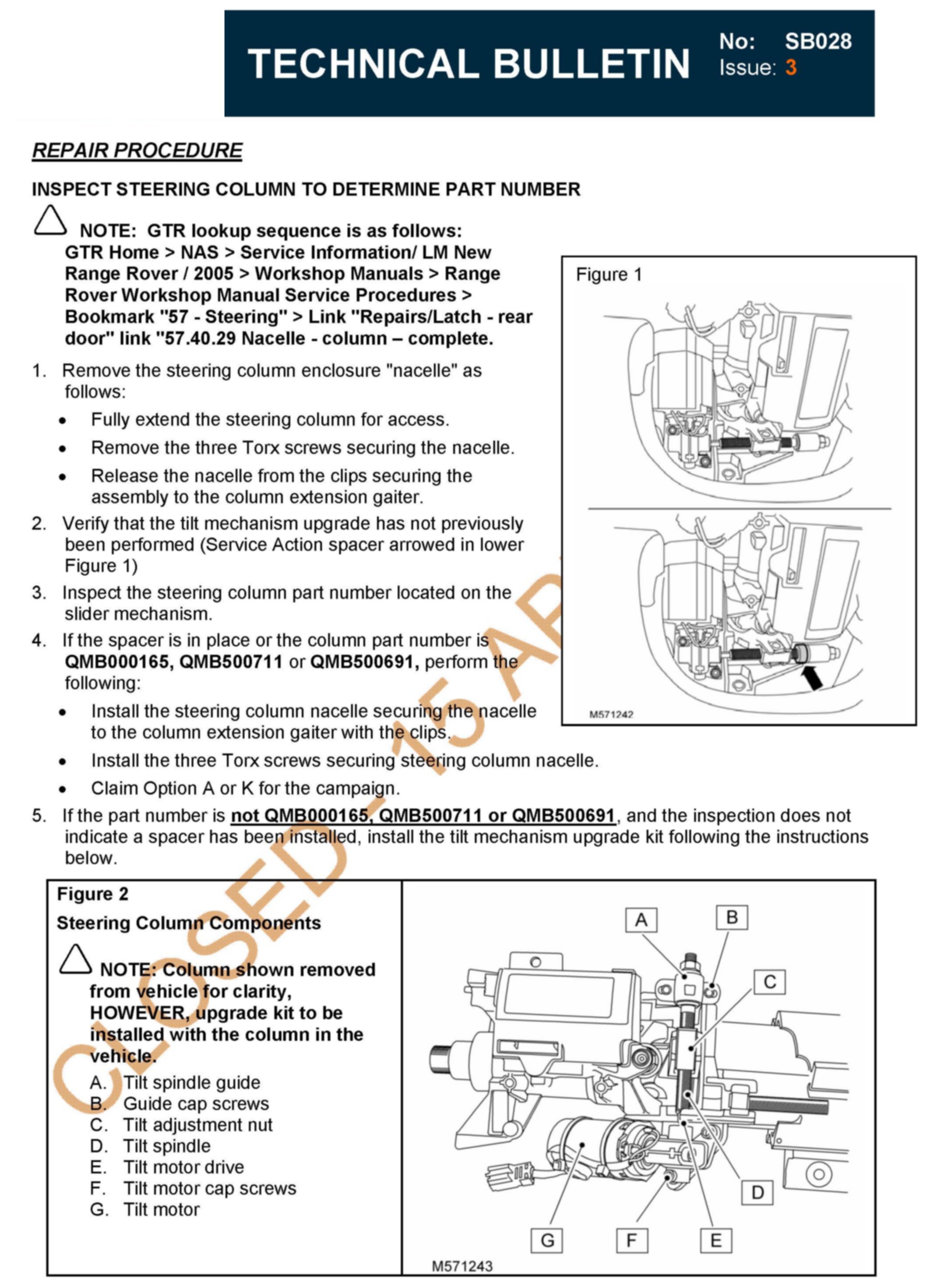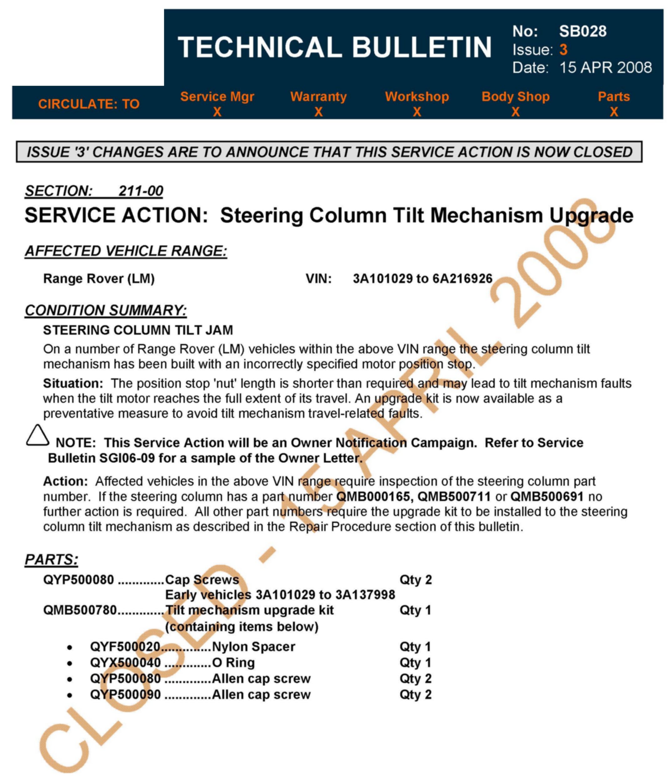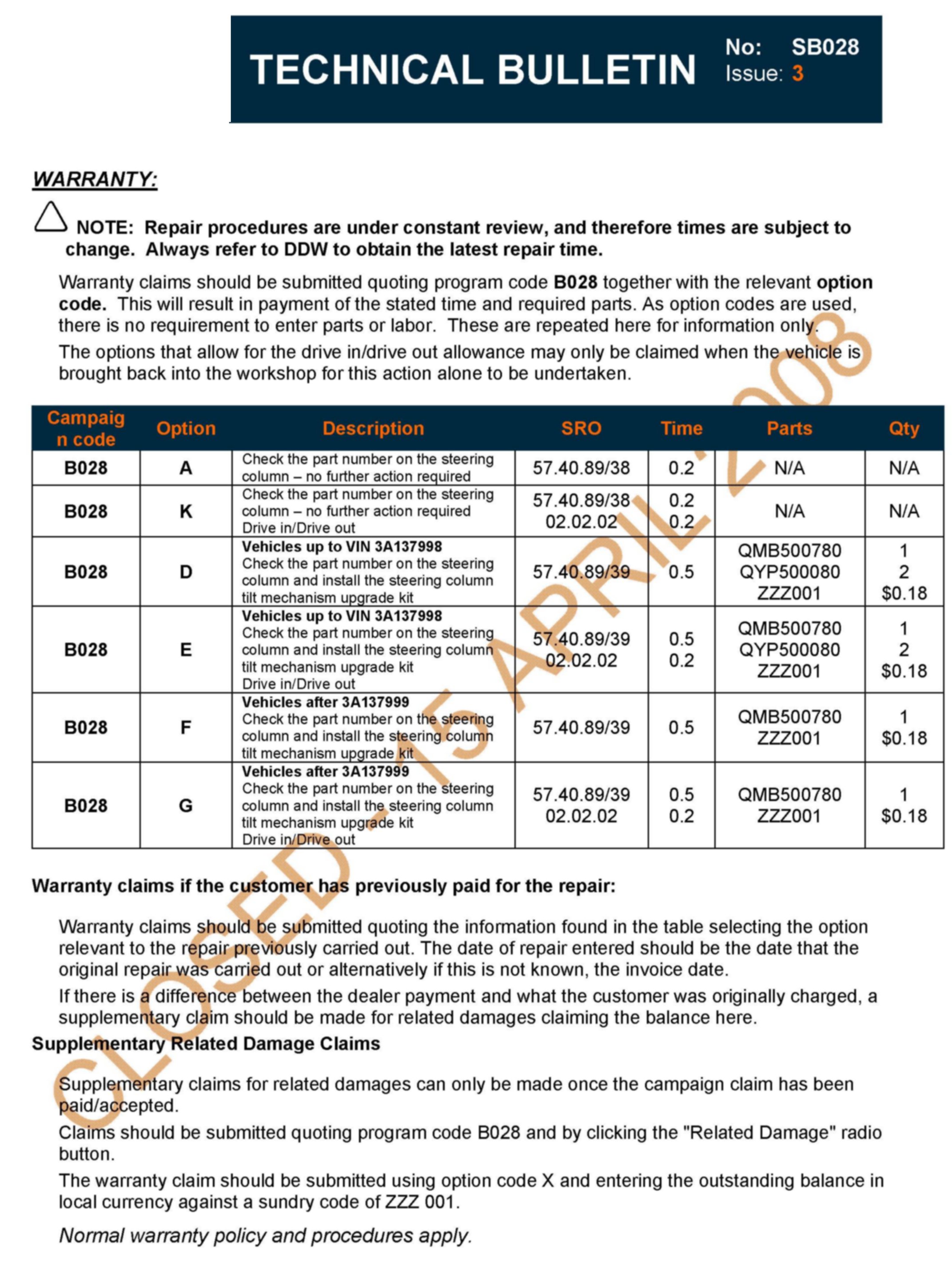 This Service Action, SB028, is closed effective 15 APRIL 2008Warranty Claims may not be submitted after Wednesday, 30 April 2008 for this Service Action.